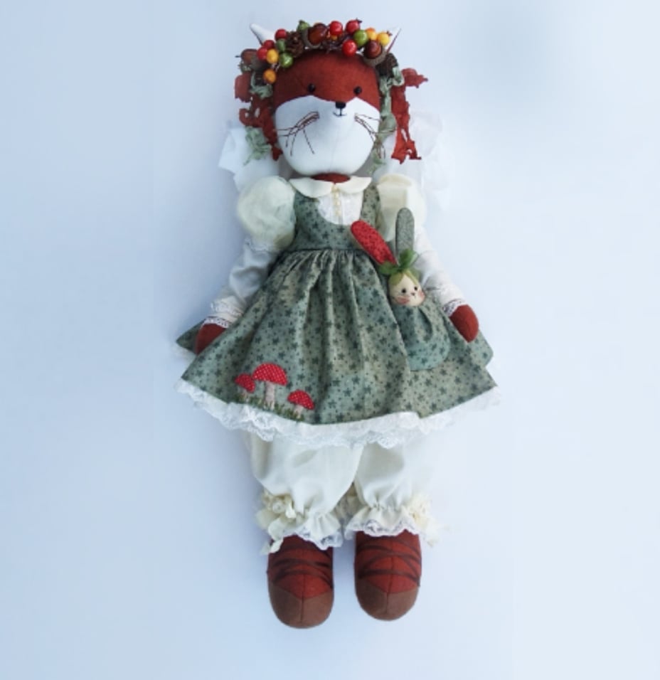 Francesca is a 22 inch, 56 cm fox, she is dressed in a long gathered dress with collar and lace, a pinafore with pocket detail and applique mushrooms, with lace and frill detail, long bloomers edged in lace finishes her look.