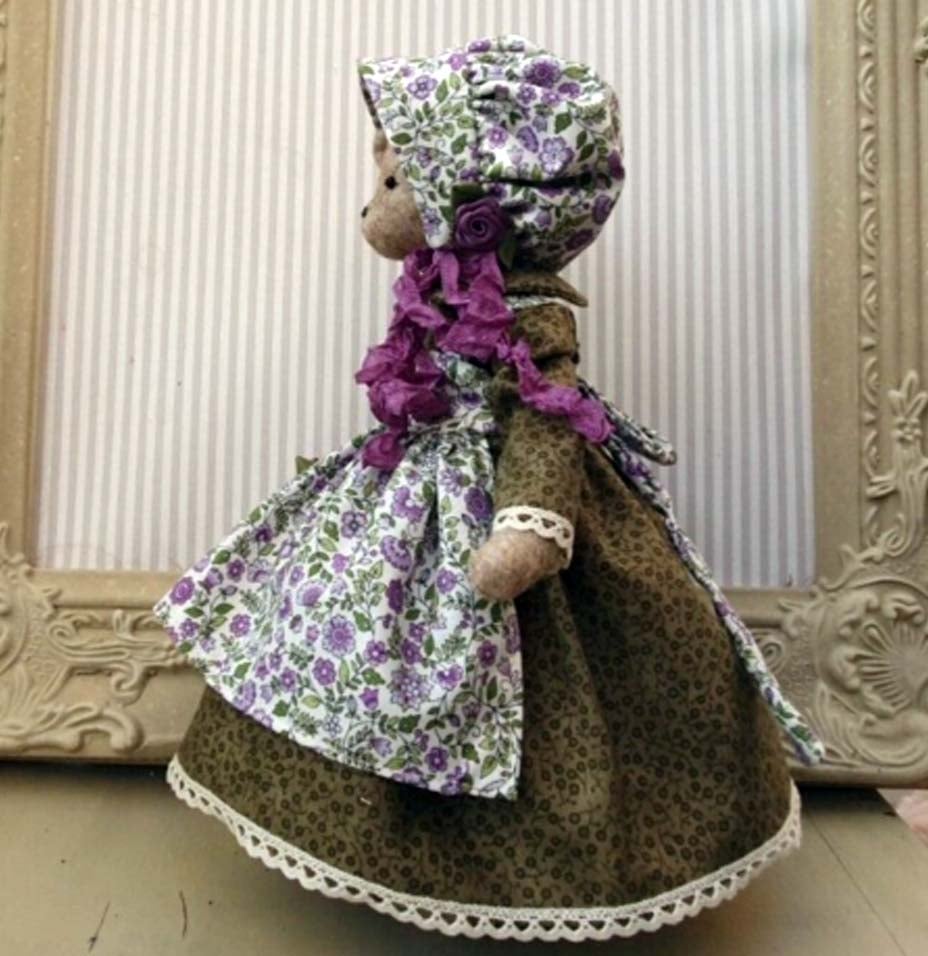 Hanah is a 10 inch 26 cm hedgehog, she is dressed in a long gathered dress with collar, a pinafore which has satin rose bud detail to the bodice and pocket, beautiful bonnet and lace edged bloomers finish of her look.