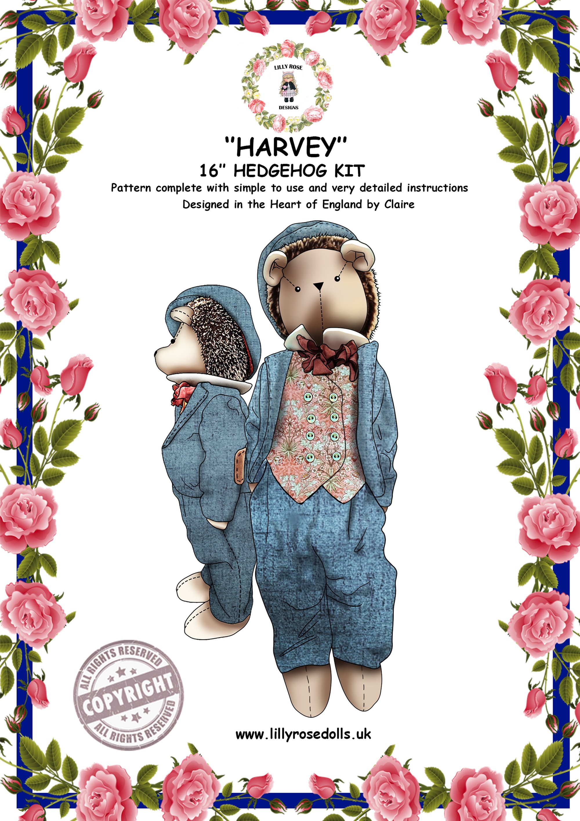 This full size pattern includes full instruction to make Harvey and all his clothes, picture diagrams and written instructions will take you through each process, tried and tested by myself, so you can create a dandy Harvey hedgehog to add to your collection or a wonderful gift.