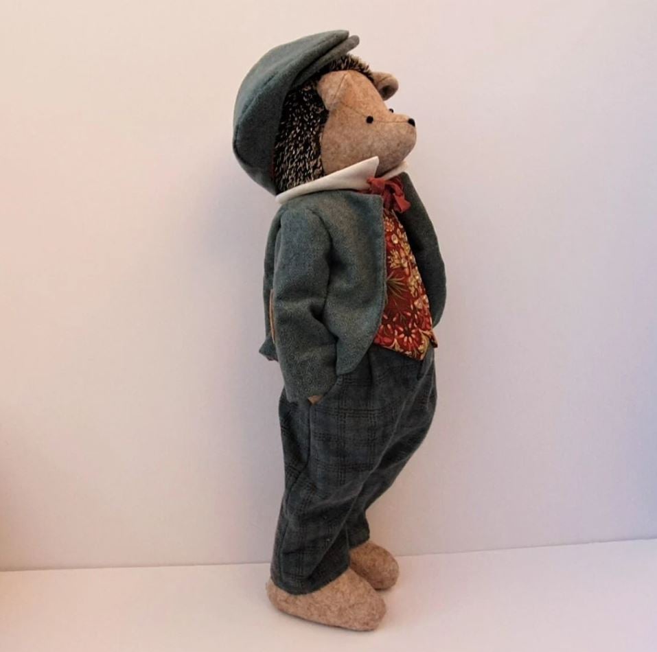 Harvey is a 16 inch 33 cm hedgehog, he is dressed in his Sunday best with smart soft flannel trousers and patterned waistcoat with button detail, finished off with a soft flannel jacket and flat cap, neck tie and shirt.
