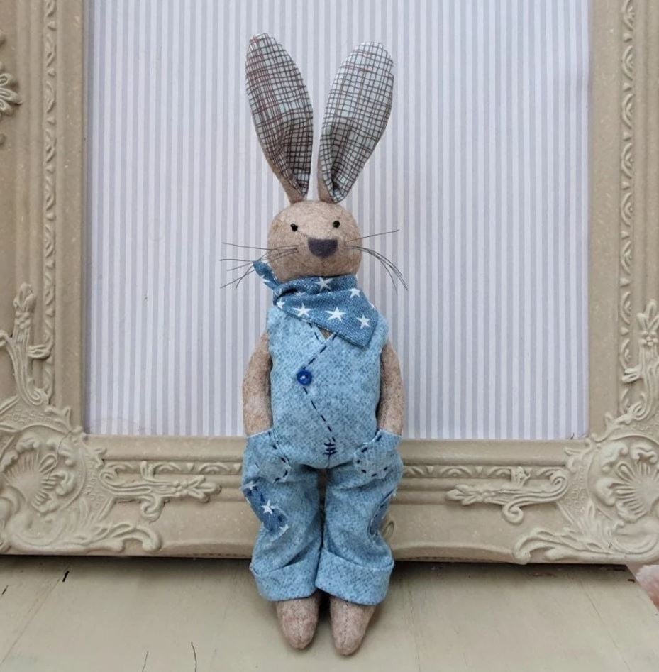 Olly is an 8 inch 20 cm rabbit, he is dressed in his Denim look jumpsuit, with pocket and frayed patches and kerchief, hand stitches finish his look.