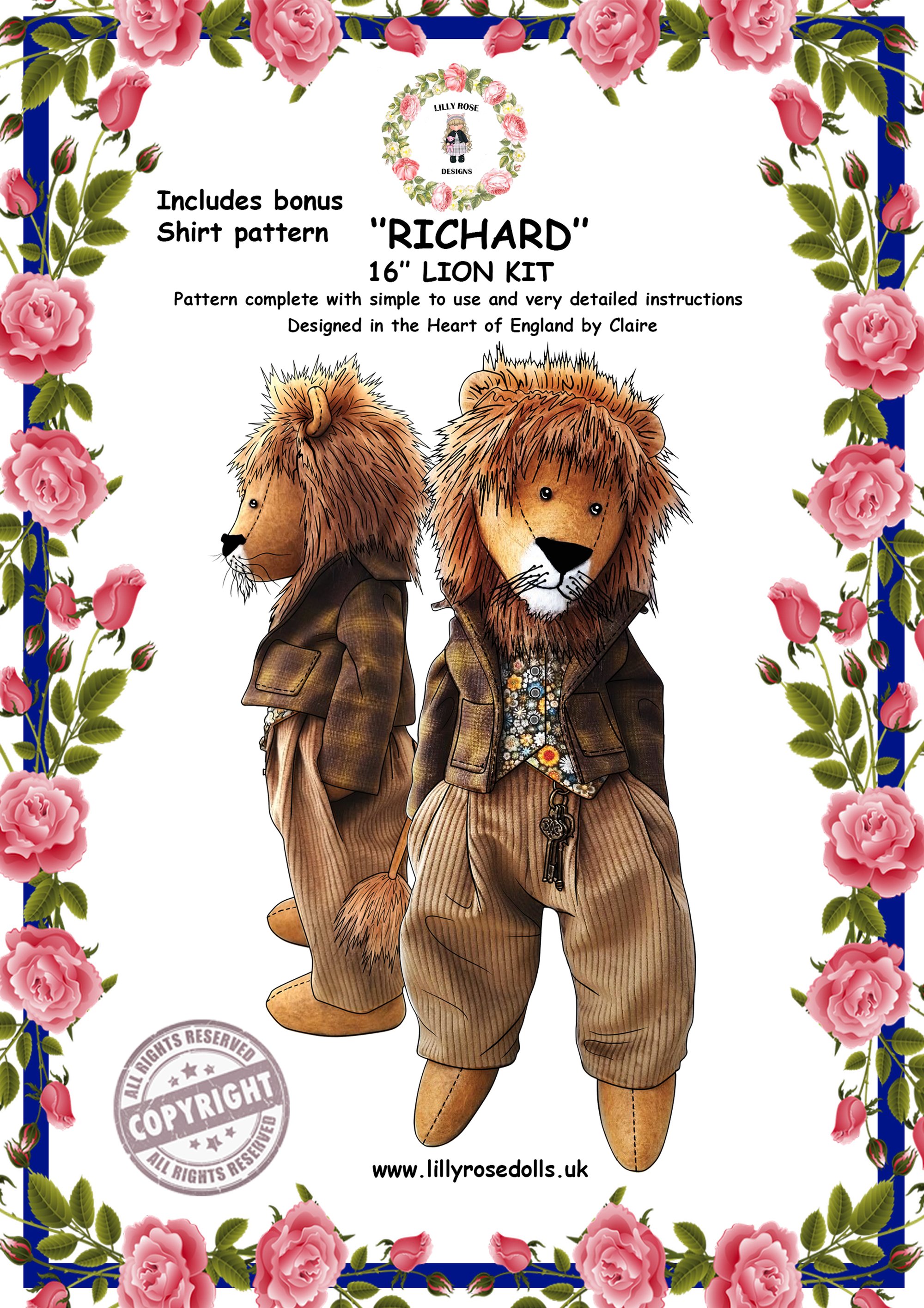 This full size pattern includes full easy to follow instructions to make Richard and all his clothes, picture diagrams and written instructions will take you through each process, designed, tried and tested by myself, so you can create a stunningly unique Richard the Lion to add to your collection or a wonderful gift.